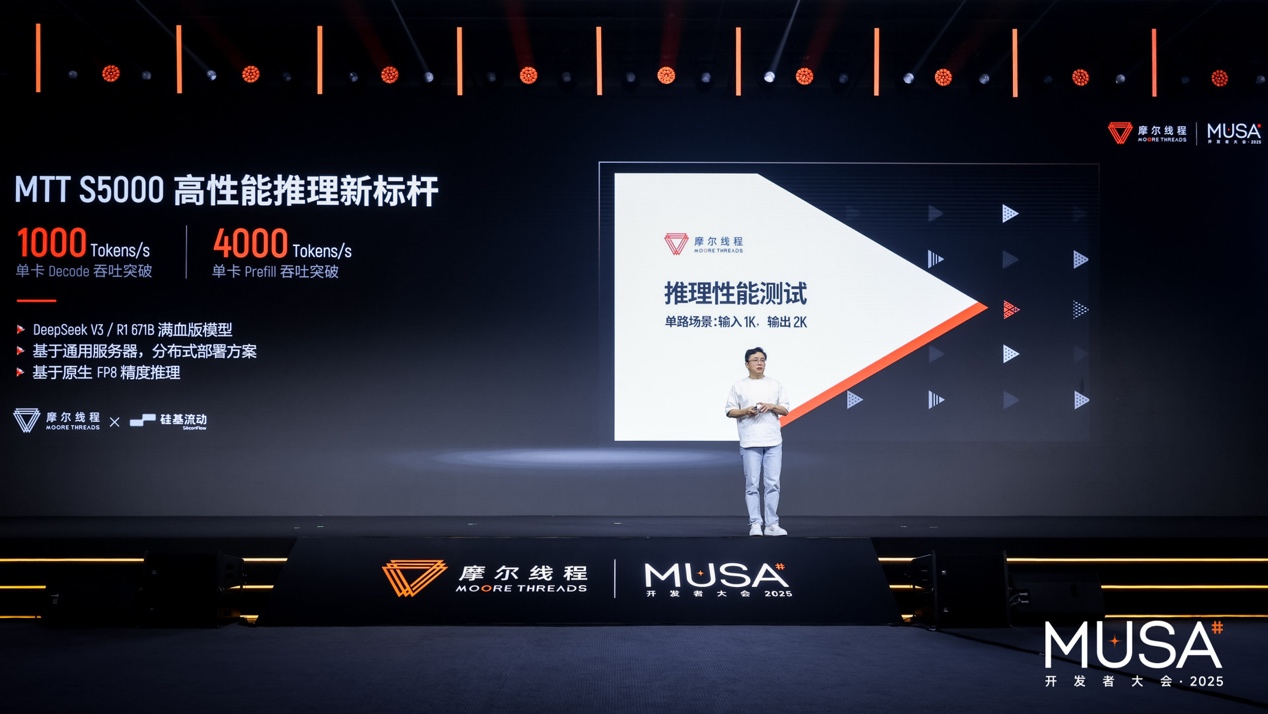 现场,摩尔线程展示了在MTT S5000单卡上运行DeepSeek R1 671B全量模型的优化实测结果。